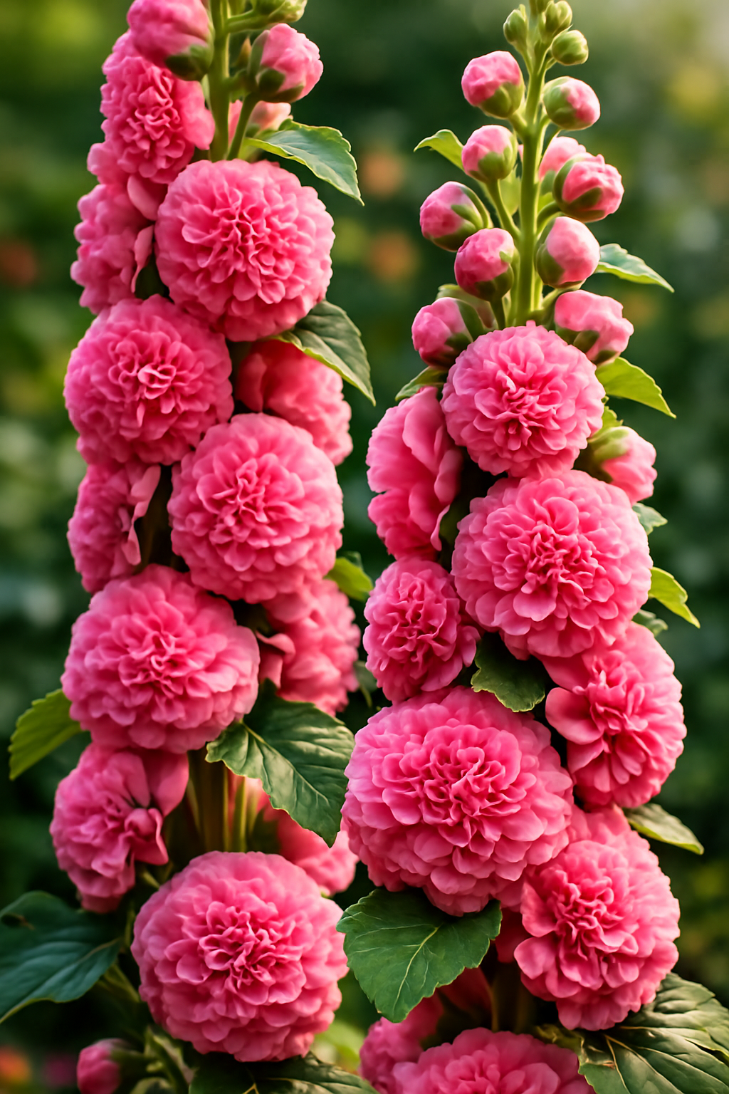 - Plants grow 5–8 ft tall with dense double flowers